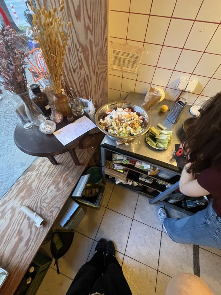 Am Mittwoch haben wir gemeinsam als Klasse gekocht. Dazu wurde uns das Prinzessinnengarten Kollektiv Berlin als Location zur Verfügung gestellt. Ein ehemaliges Nagelstudio, das zu einer Gemeinschaftsküche umgebaut wurde. Jede*r hat ein Gemüse mitgebracht. Nach dem gemeinsamen Essen war mehr als genug übrig. Das Büffet war stets offen für alle Passant*innen.