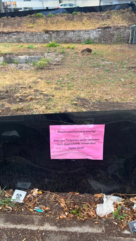 Für uns die perfekt Möglichkeit mit unserem gesammelten Wissen und unseren Erfahrungen eine „Intervention“ zu starten. Wir begannen Erde aufzuschütten und Blumen zu sähen. Wir nutzen Materialien aus der unmittelbaren Umgebung um die den kleinen Erdhügel zu verschatten. Wir gossen den Erdhügel täglich mehrmals und bekamen somit mit was sich alles auf dem Grundstück so tut. Denn die Pflanzen um unseren Erdhügel wurden immer weniger und keiner konnte uns konkrete Auskunft geben, wann genau auch dieser grüne Bereich von den Bauarbeiten überlagert sein werden wird.