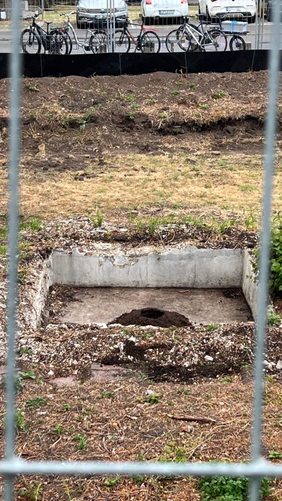 Die Bauarbeiten schritten voran und der grüne eigentlich ungenutzte Bereich vor dem Künstlerbau begann uns mehr und mehr ins Auge zu fallen, da dieser ebenso von dem Bau betroffen sein wird. Innerhalb der Grünfläche gibt es einen kleinen betonierten Bereich.