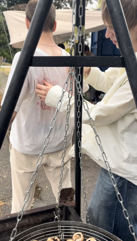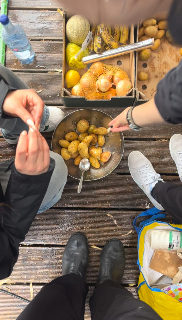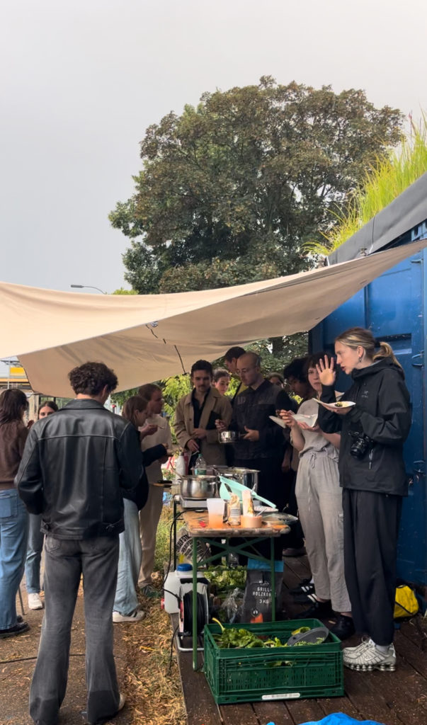 Voll beladen machten wir uns auf den Weg zur Neckarinsel und wurden dort freundlichst empfangen. Auf einmal begann es zu regnen doch dadurch sollte die gemeinsame „After Work“ Party nicht ins Wasser fallen! Wir waren gegen den Regen gewappnet und spannten eine Plane über unsere Kochstellle- das kollektive Kochen und Grillen konnte beginnen. Dicht an dicht unter der Plane schnibbelten, grillten, kochten und verkosteten wir das Curry, mitsamt Salaten und Grillgemüse und bewachten den Grill. Jeder brachte sich ein und hatte Spaß am gemeinsamen Kochen.
